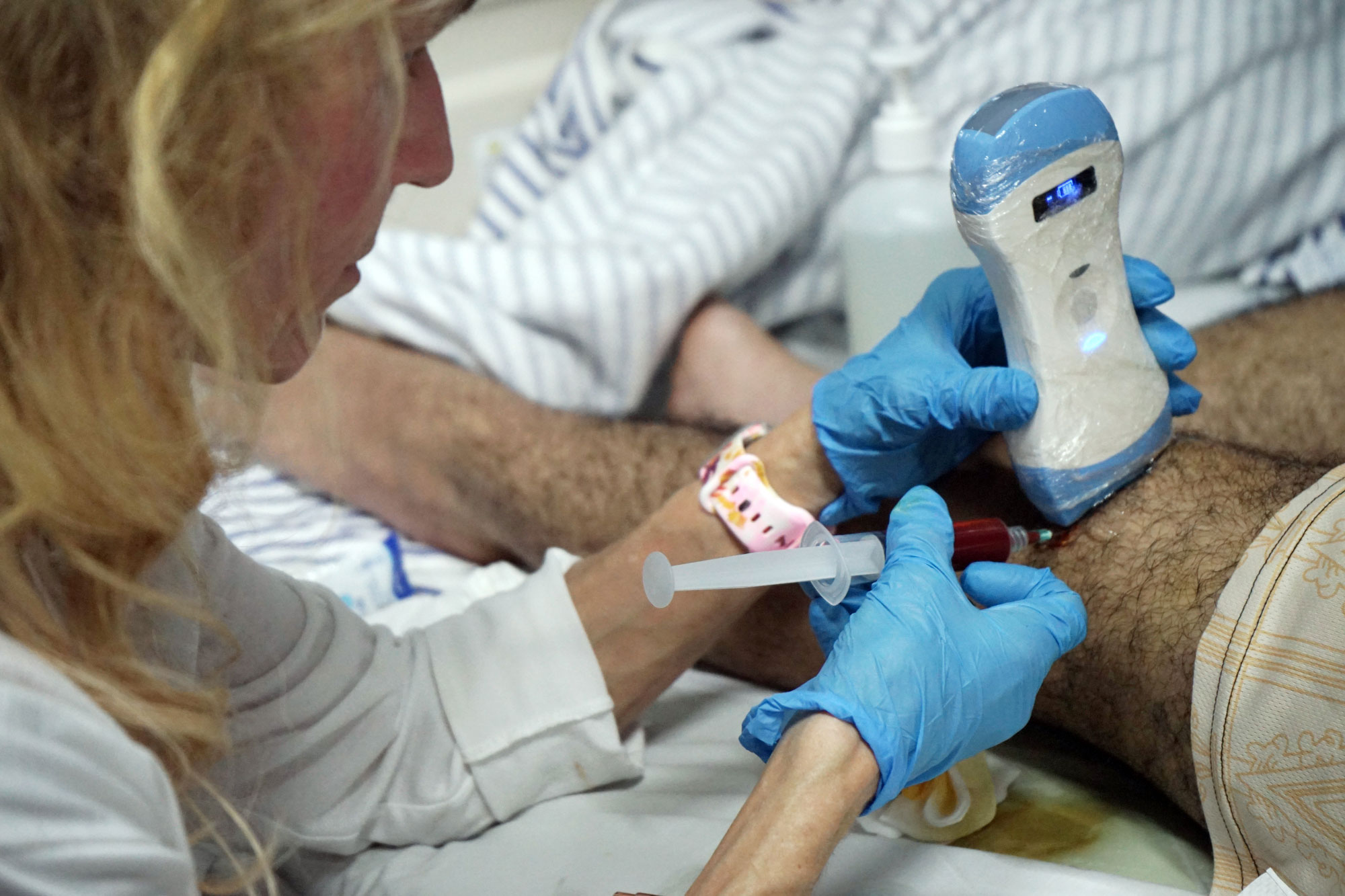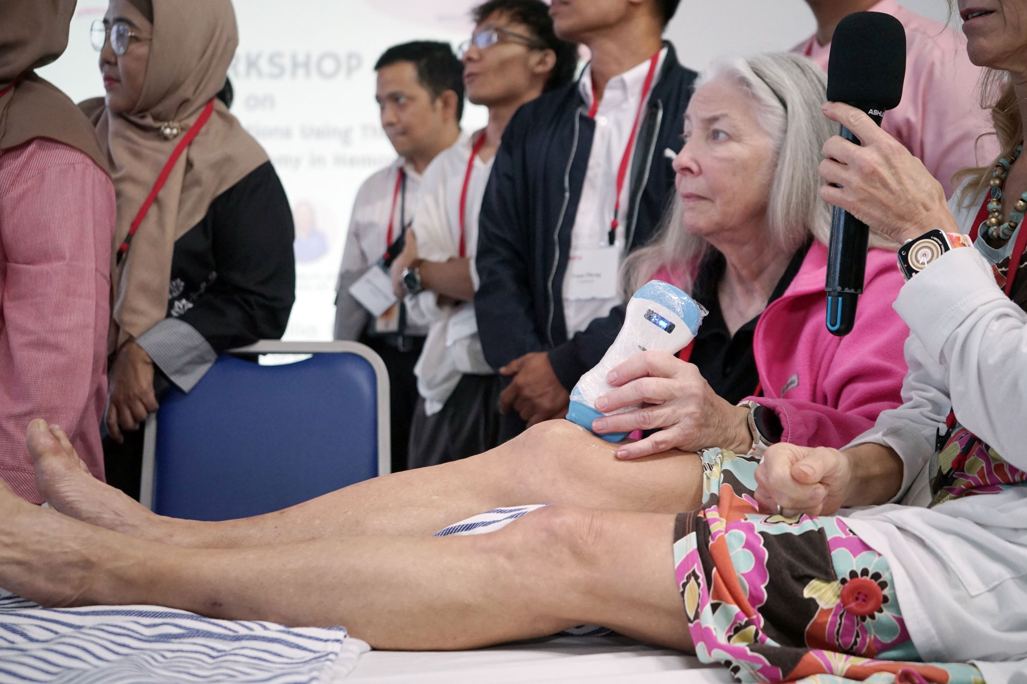 Chuyên gia hướng dẫn các học viên đánh giá tình trạng khớp bằng thiết bị siêu âm tại chỗ (point-of-care ultrasound).